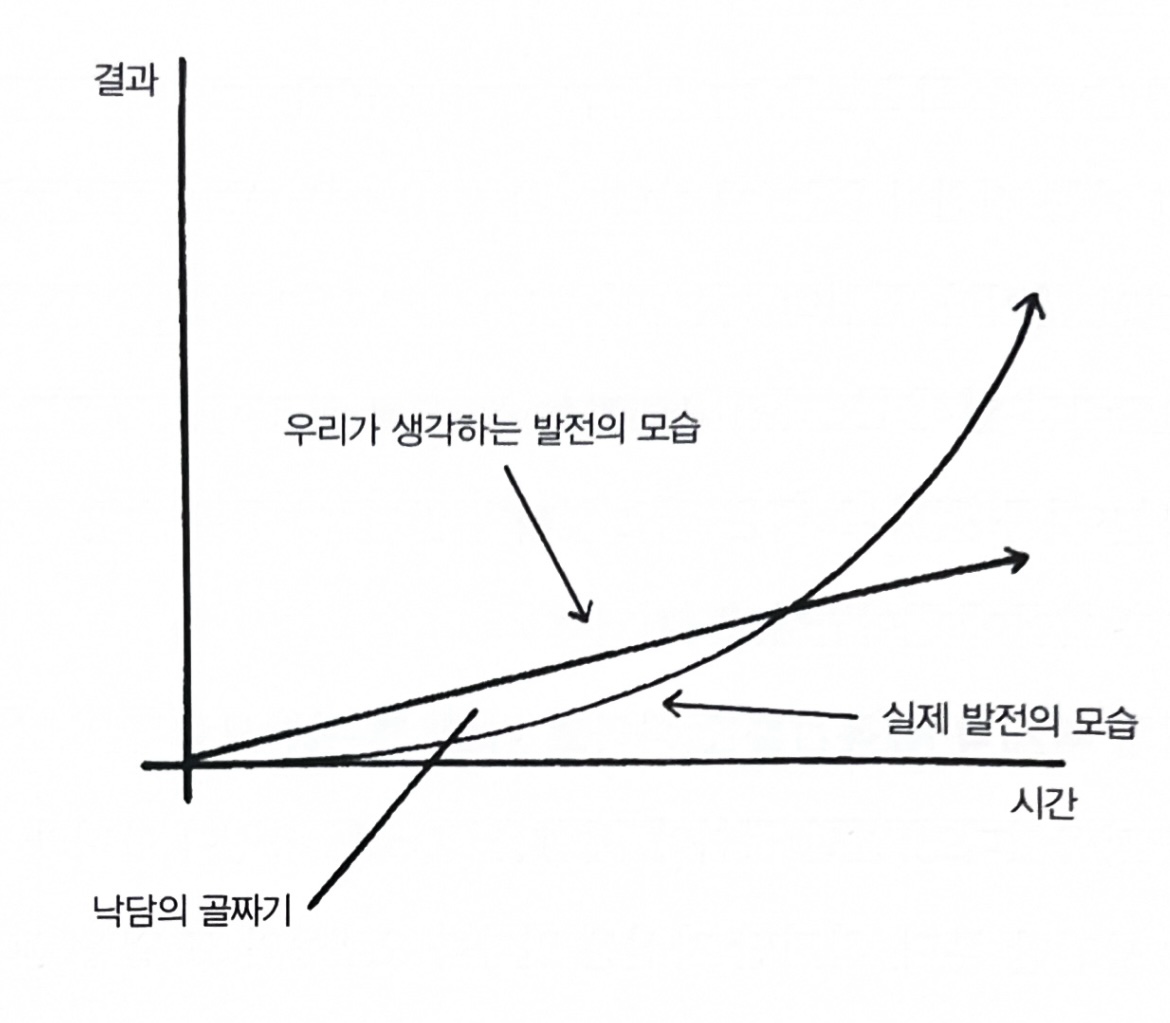 그래서 결국 습관이란 처음에는 아무런 변화도 보이지 않다가 그 행동을 계속함으로써 갑자기 변화가 일어난다. 그렇기에 보상은 지연되어 올 수 밖에 없고 당장에 확실한 보상을 원하는 우리의 뇌는 이러한 습관이 의미 없이 에너지를 낭비하는 행동이라 생각한다.