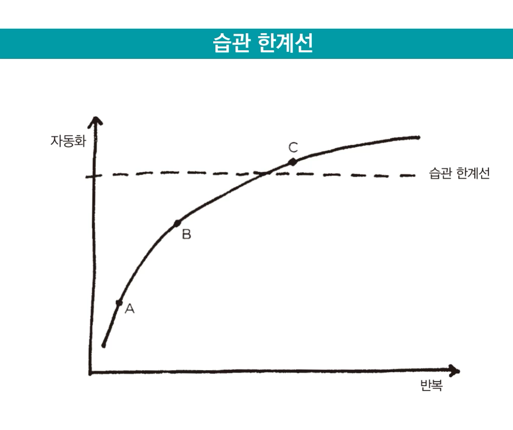 위 습관이 형성되는 그래프를 보면 처음에는 A에서 시작한다. 습관이 형성되기 가장 어려운 시기이다. 내가 행동하는 것을 의식적으로 해야 하기 때문인데, 그 행동을 계속 반복하면 B를 거쳐 점차 C에 이른다. C에 이르게 되면 더 이상 생각하고 행동할 필요 없이 몸이 자동화 되는 것이다.
