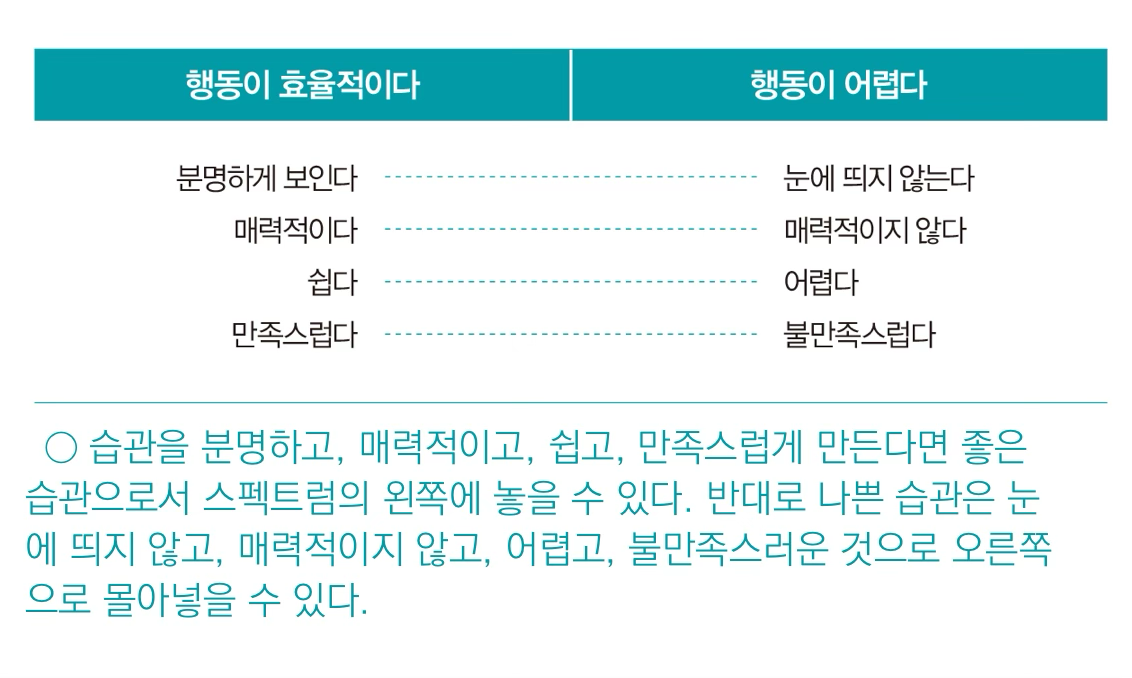 인간의 행동은 최소 노력 법칙에 따른다. 인간은 항상 가기 쉬운 길로 가게끔 프로그래밍 되어 있다. 그래서 만약 습관을 만들고 싶다면 최대한 쉽게 주변의 방해는 없게끔 환경을 조성해야 하는 것이다. 예를 들어 책을 읽는 습관을 만들고 싶은데 “아침 출근 전에 1시간 일찍 일어나서 책을 읽겠다” 라고 한다면 이는 원래 있던 생활패턴을 깨는 어려운 것이고 또한 원래 책을 읽지 않던 사람이 1시간 책을 본다는 건 어려운 일이다.